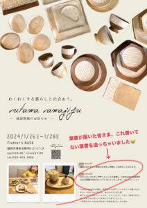 - rutawa.rawajifu陶器個展【日時】1月26,27,28の3日間10:00〜17:00【場所】博多区那珂3-27-27 2F Flutter’s BASETEL 092-409-2986前回の個展に来てくださったお客様に、先日個展のお知らせ葉書を送らせていただいたのですが、どうやらデータを差し間違えてしまったようで、こちらが書かれてなかったみたいです( ;∀;)先着順ではございますがお葉書をお持ちでない方にもプレゼントいたします♪皆様のご来場お待ちしております☺️