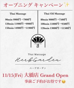 オープンを記念しまして本日〜11月14日までに事前ご予約をしていただいたお客様に限り、下記のお得な金額でマッサージさせていただきます🪷