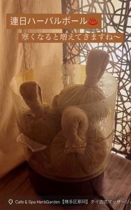 ハーバルボールは16種類の薬効ハーブが入った布をボール状にしたもので、